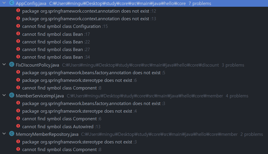 인텔리제이로 작업 중이었던 프로젝트가 갑자기 실행이 안되고 다음과 같이 빨간줄 천지가 되었다.